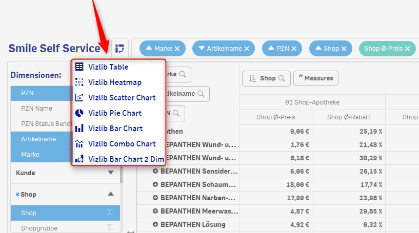 (2) Als Beispiel wählen wir hier als Dimensionen: Marke, Artikelname, PZN, Shop und als (3) Messgröße den durchschnittlichen Shop-Preis und Rabatt. Für eine Visualisierung (4) klicken wir auf die Glühbirne und wählen die Option “Vizlib Pivot Table”.