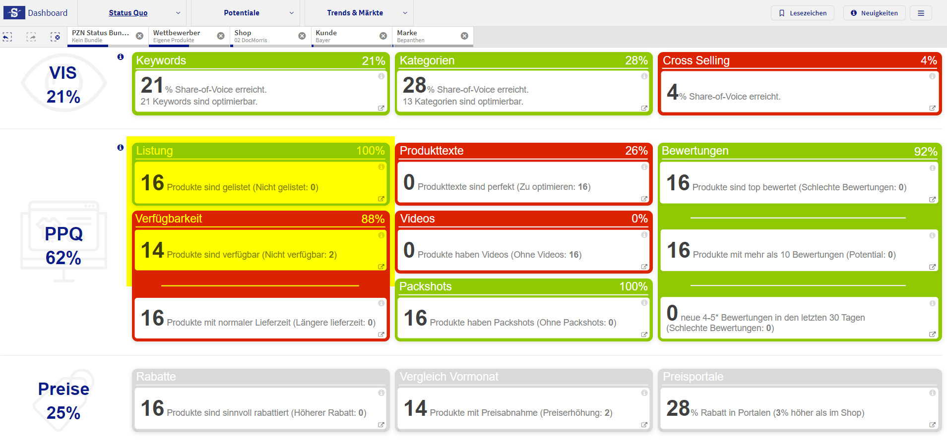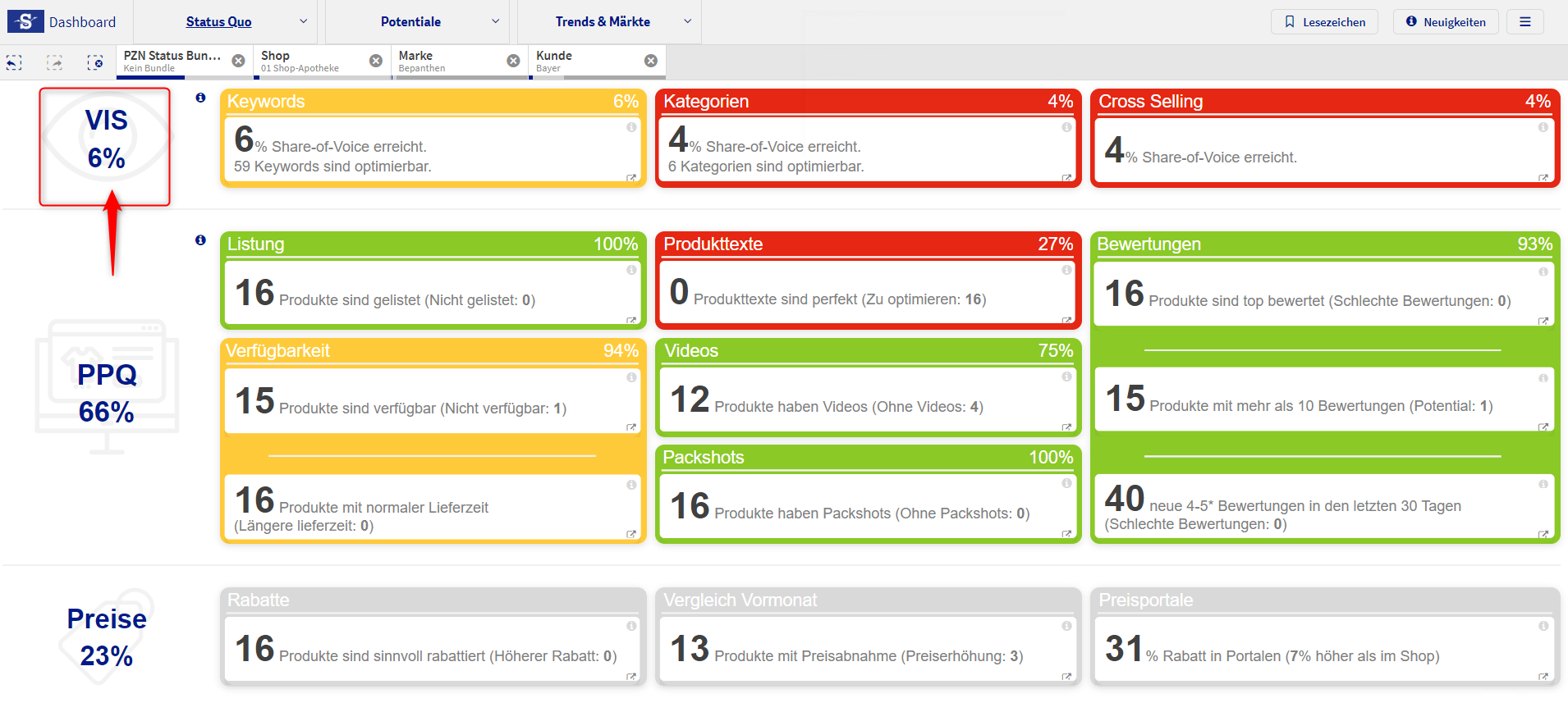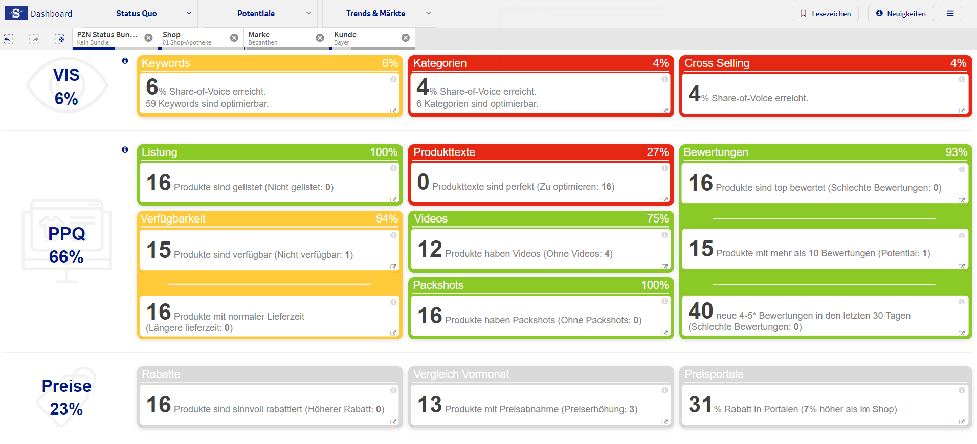 Die Status Quo Dashboard Ansicht gibt auf einem Blick Auskunft darüber, wie die aktuelle Performance der ausgewählten Brands bzw. PZNs im jeweiligen Shop ist. Die Daten werden mehrmals täglich abgerufen und werden dem letzten Stand im Dashboard abgebildet. Anders als in Trends & Märkte, in denen Zeiträume dargestellt werden, werden hier nur Tagesdaten abgebildet.