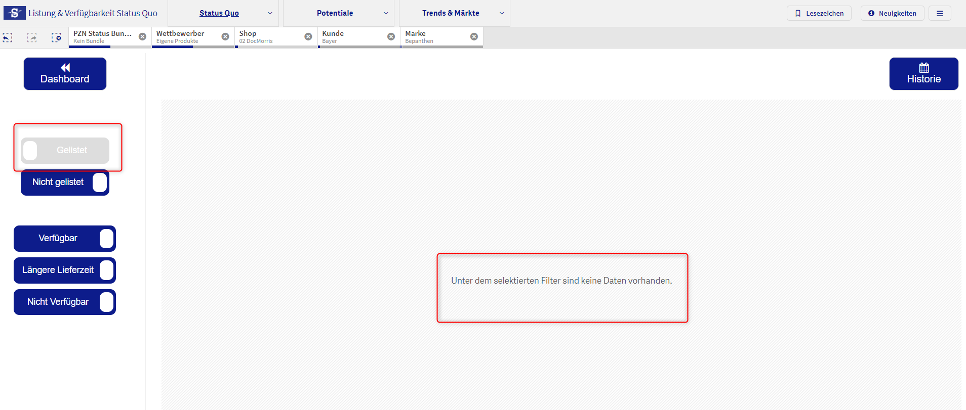 Um zu analysieren, welche PZNs, in welchen Shops (nicht) gelistet bzw. (nicht) verfügbar sind, können wir im nächsten Schritt auf Listung bzw. Verfügbarkeit klicken, oder auch alternativ die Navigationsleiste nutzen.