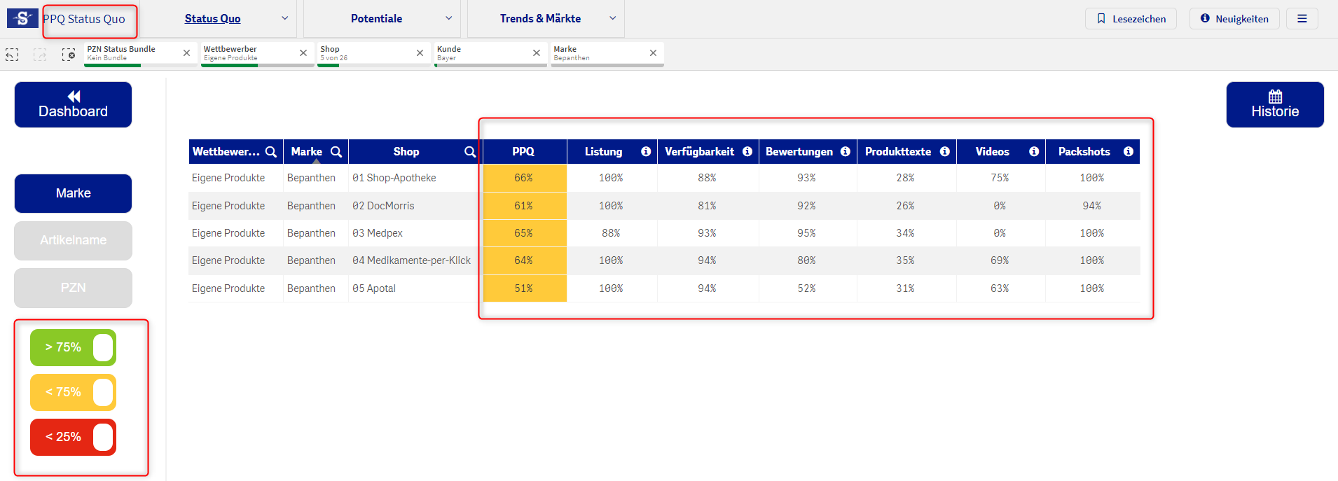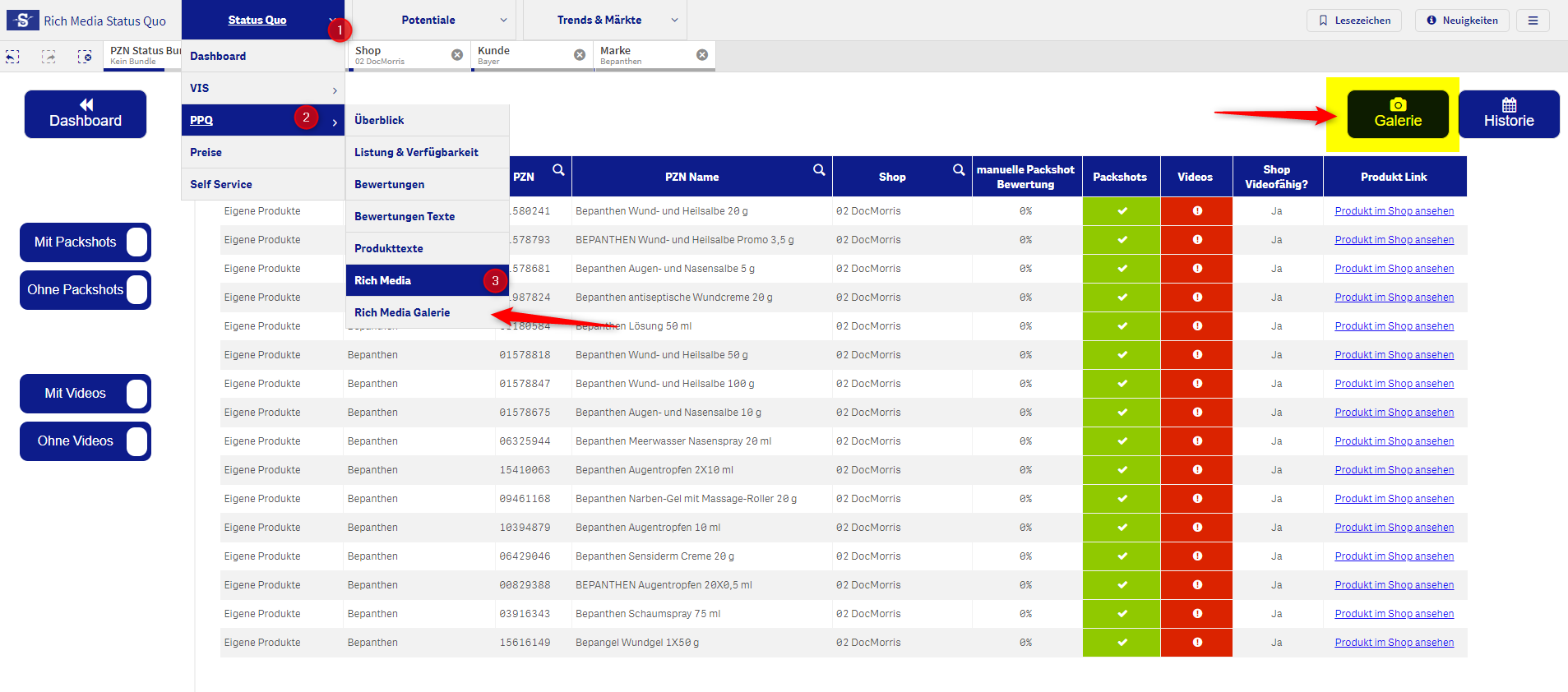 Die Spalte “Packshot/Video” gibt an, ob ein Packshot/Video im jeweiligen Shop für ein Produkt vorhanden ist (grün), oder nicht (rot). Lesebeispiel: Bei dem Produkt Bepanthen Wund- und Heilsalbe 20 g sind Packshots vorhanden. Video(s) sind nicht vorhanden (Zeile 1).