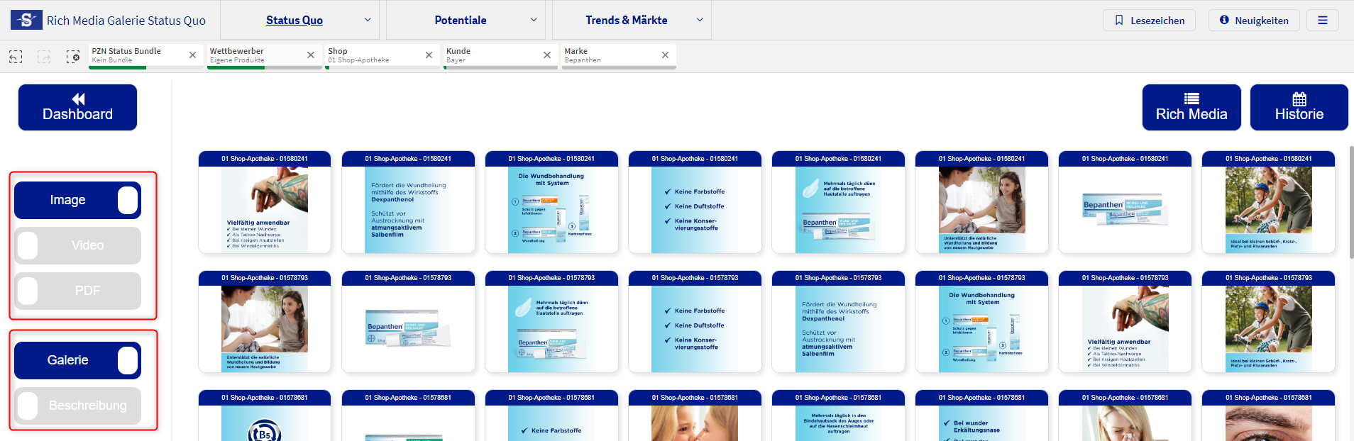 Über den Button “Galerie” gibt es einen Shortcut zur Packshot bzw Videogalerie, um zu prüfen, ob gewünschte Packshots eingebunden sind. Alternativ ist der Zugang auch über die Navigationsleiste möglich.
