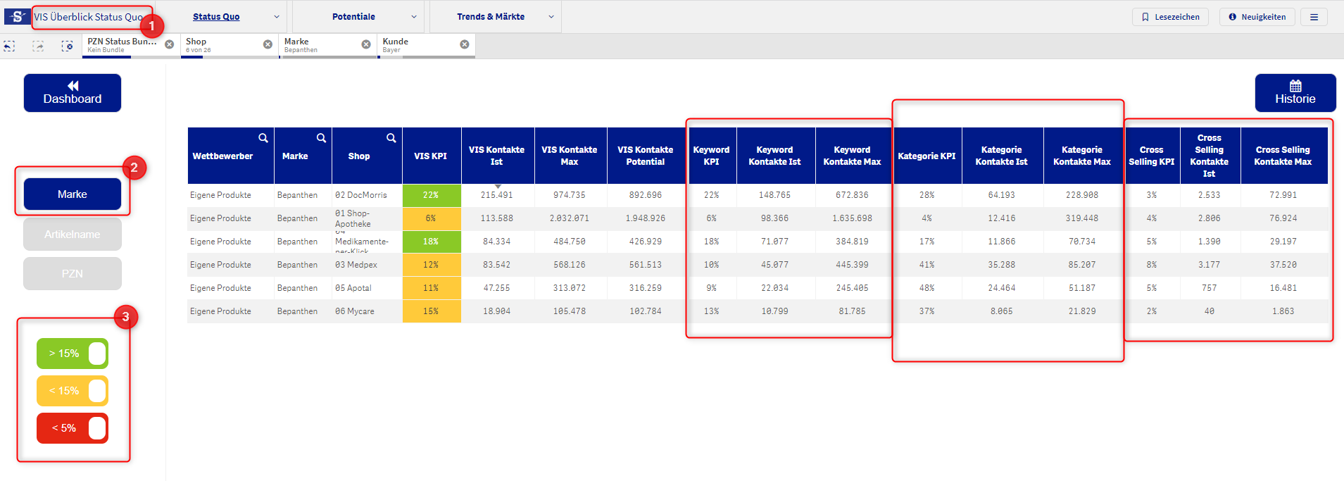 Nach dem Klick auf die VIS KPI, gelangst du auf die Detailansicht und die Aufschlüsselung (rot eingerahmte Bereiche) der VIS KPI in einzelne Shops. Um es besser zu veranschaulichen, sind hier mehrere Shops ausgewählt.