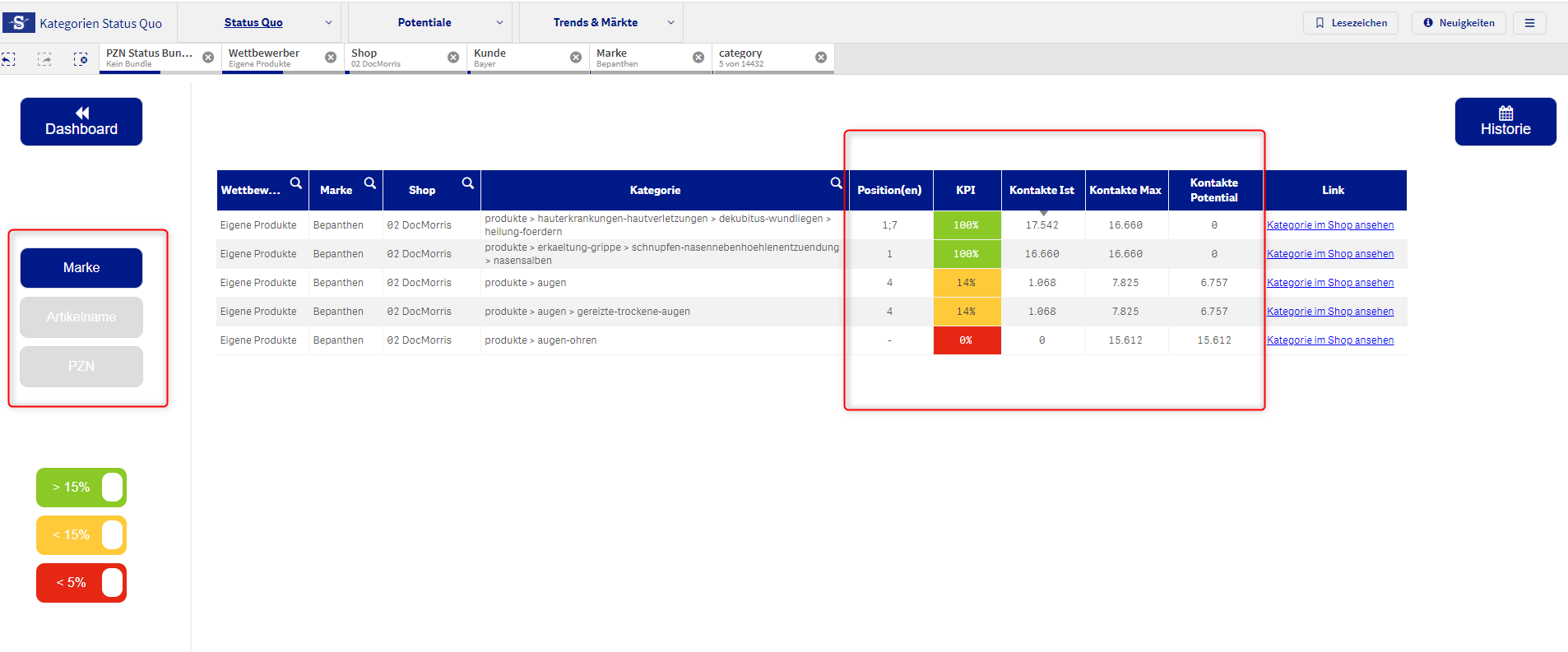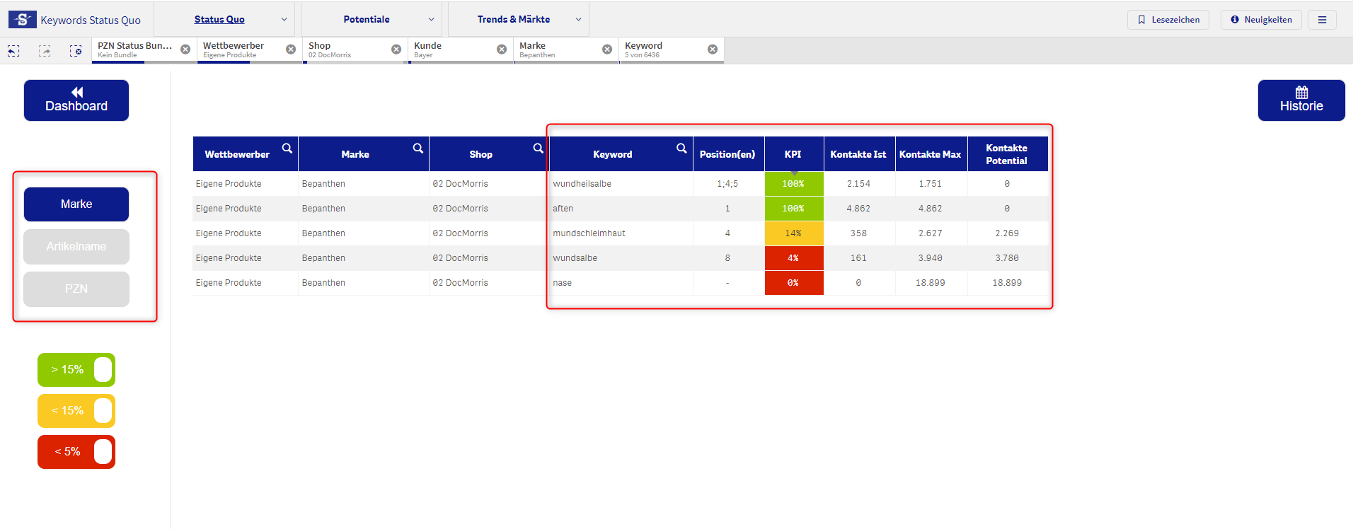 - Brand Bepanthen wird in Docmorris für das Keyword “aften” an Position 1 ausgespielt und erreicht somit die maximale Kontaktanzahl und 100% Keyword KPI.