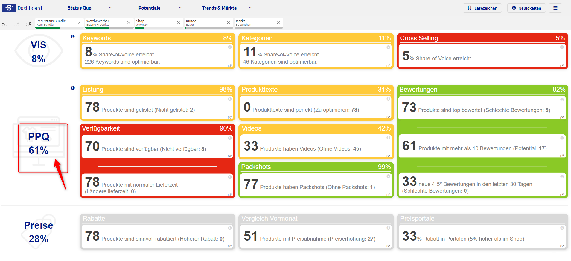 Nach einem Klick auf die PPQ KPI im Dashboard, gelangt man auf die Überblickseite, auf der wir uns abhängig von der Analyseebene einen Überblick über den aktuellen Stand der Produktdetailseiten machen können.